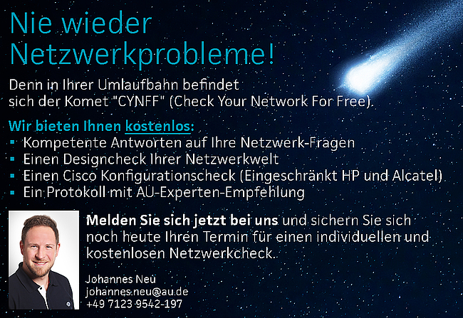 Laut den aktuellen AU-Netzwerkwelt-News befindet sich der Komet "CYNFF" (Check Your Network For Free) in Ihrer Umlaufbahn und ist seit Februar 2020 bei Ihnen am Sternenhimmel zu sehen. Lassen Sie Ihre Netzwerkwelt kostenlos von unseren Experten analysieren um noch heute Ihr Netzwerk zukunftssicher und stabil zu gestalten.