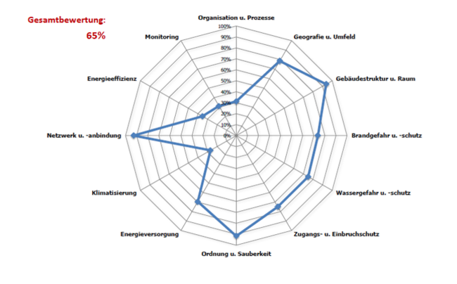 Als Ergebnis erhalten Sie eine ganzheitliche und übersichtliche Bewertung der Betriebssicherheit und Energieeffizienz Ihres Rechen-zentrums. Es werden gezielt Stärken und Schwächen aufgezeigt, so dass hieraus vorhandenes Optimierungspotenzial abgeleitet werden kann.