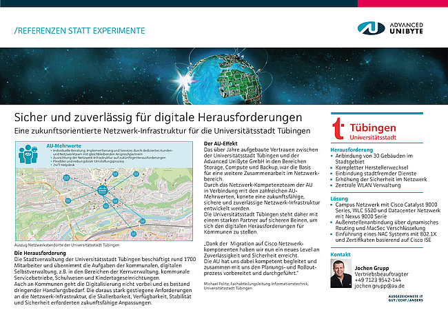 Gemeinsam mit der Stadt Tübingen und dem AU-Expertenteam wurde eine zukunftsfähige Lösung entwickelt, die in Verbindung mit den AU-Mehrwerten das Netzwerk der Kommune sicher und zuverlässig macht.