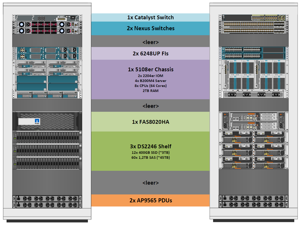 1x NetApp FAS HA-System mit insgesamt ~3TB SSD und ~45TB SAS Speicher