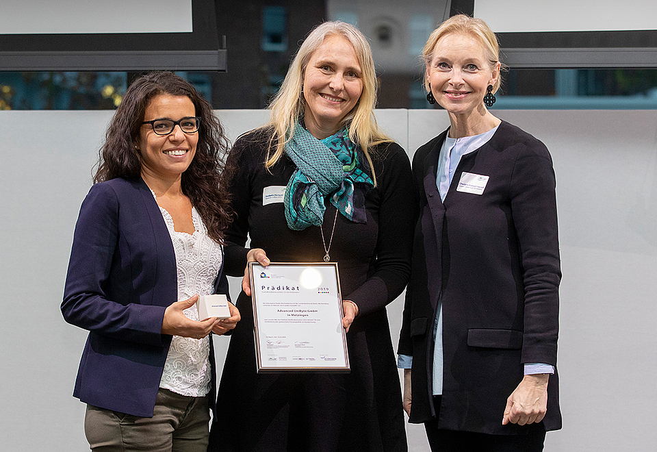 Die Laudatorin Charlotte Knappertsbusch, Personalmarketing/Employer Branding der Chemie-Verbände Baden Württemberg, würdigte insbesondere die firmeneigene Kinderbetreuung (TigeR) bei Advanced UniByte, die gemeinschaftlich entwickelten Führungsleitlinien und die im Unternehmen spürbar gelebte Unternehmensphilosophie GUT / ECHT / ANDERS.
