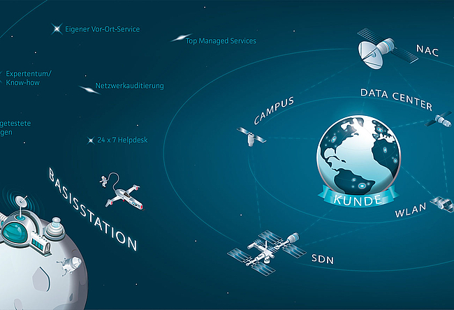Unsere Sterne sind unsere AU-Mehrwerte und tragen die Namen "Begleitung von A bis U", "Laborgetestete Lösungen", "Eigener Vor-Ort-Service", "Netzwerkauditierung" - und es gibt noch weitere von Ihnen zu entdecken. All diese Mehrwerte bringen wir als AU mit in Ihre Netzwerkwelt! Der AU-Raumgleiter, mit all seinen Netzwerk-Experten, bewegt sich kontinuierlich zwischen Ihnen und unserer 24x7 empfangsbereiten Basisstation, um im Ernstfall schnellstmöglich bei Ihnen oder Ihren Satelliten vor Ort zu sein.